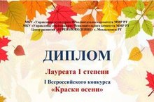 Воспитанники детского сада Кирилл А. и Лия А. (руководитель — Гайсина Т.В.) и ученик 1 класса Айзат Б. (руководитель — Толкина Л.А.) награждены дипломами лауреата I степени за участие в I Всероссийском конкурсе «Краски осени».