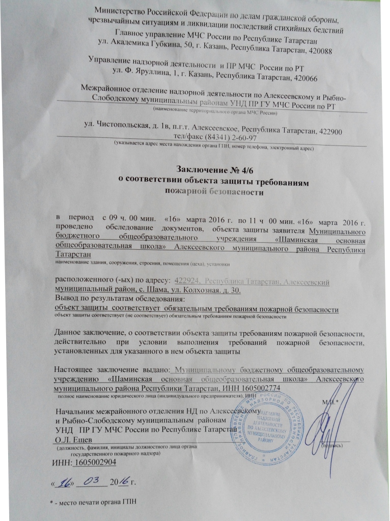 Заключение о соответствии объекта защиты требованиям пожарной безопасности (2016)