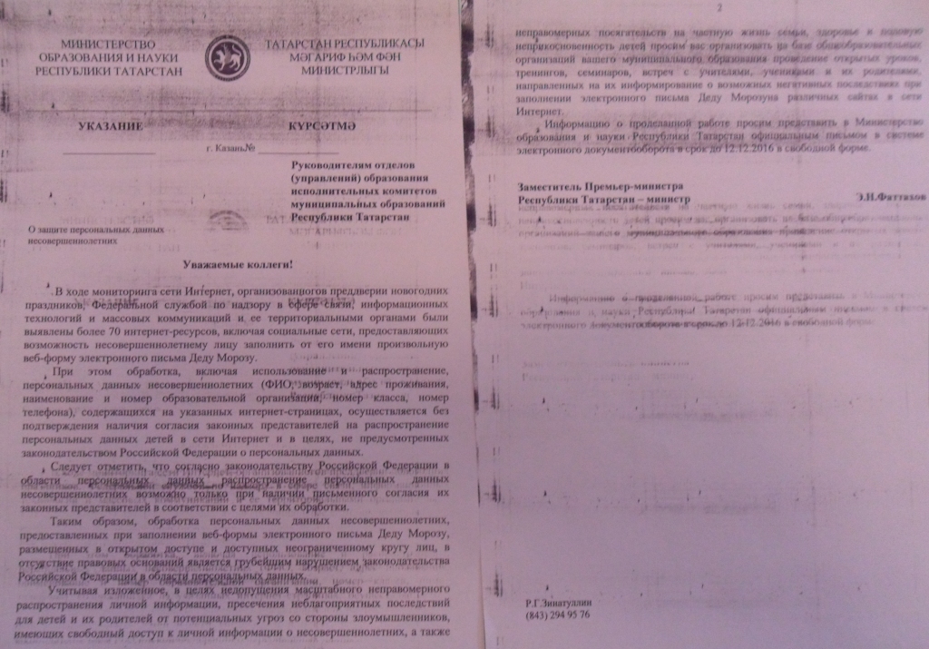 Указание МОиН РТ "О защите персональных данных несовершеннолетних";