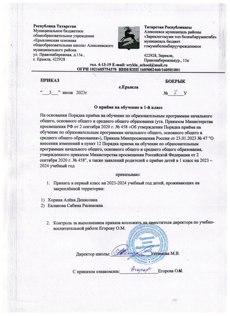 ►Приказ (школьный) № 22 /ОД от 27.03.2023 "Об организации работы по приёму заявлений о зачислении в МБОУ "Ерыклинская ООШ" в 2023 году"