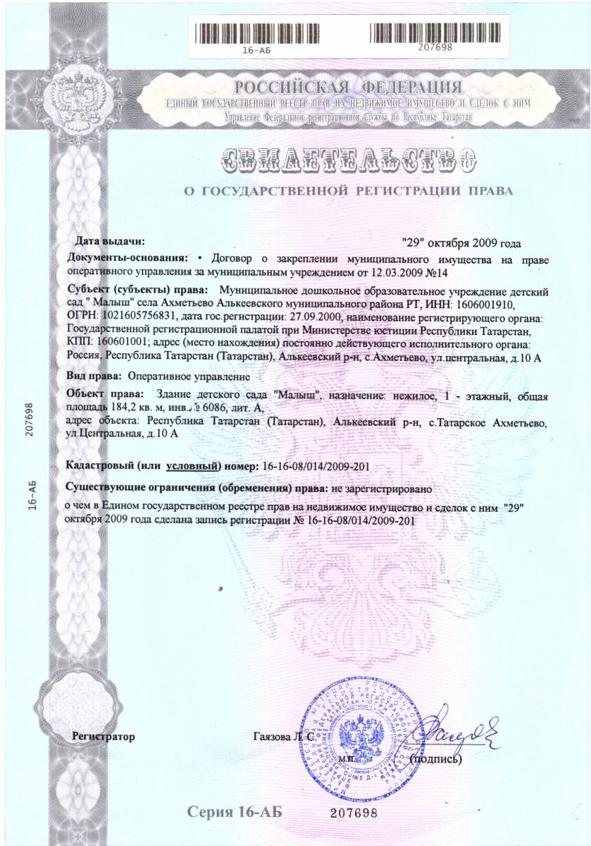 | Короткое название: | МБДОУ детский сад «Малыш» села Ахметьево Алькеевского МР РТ |
