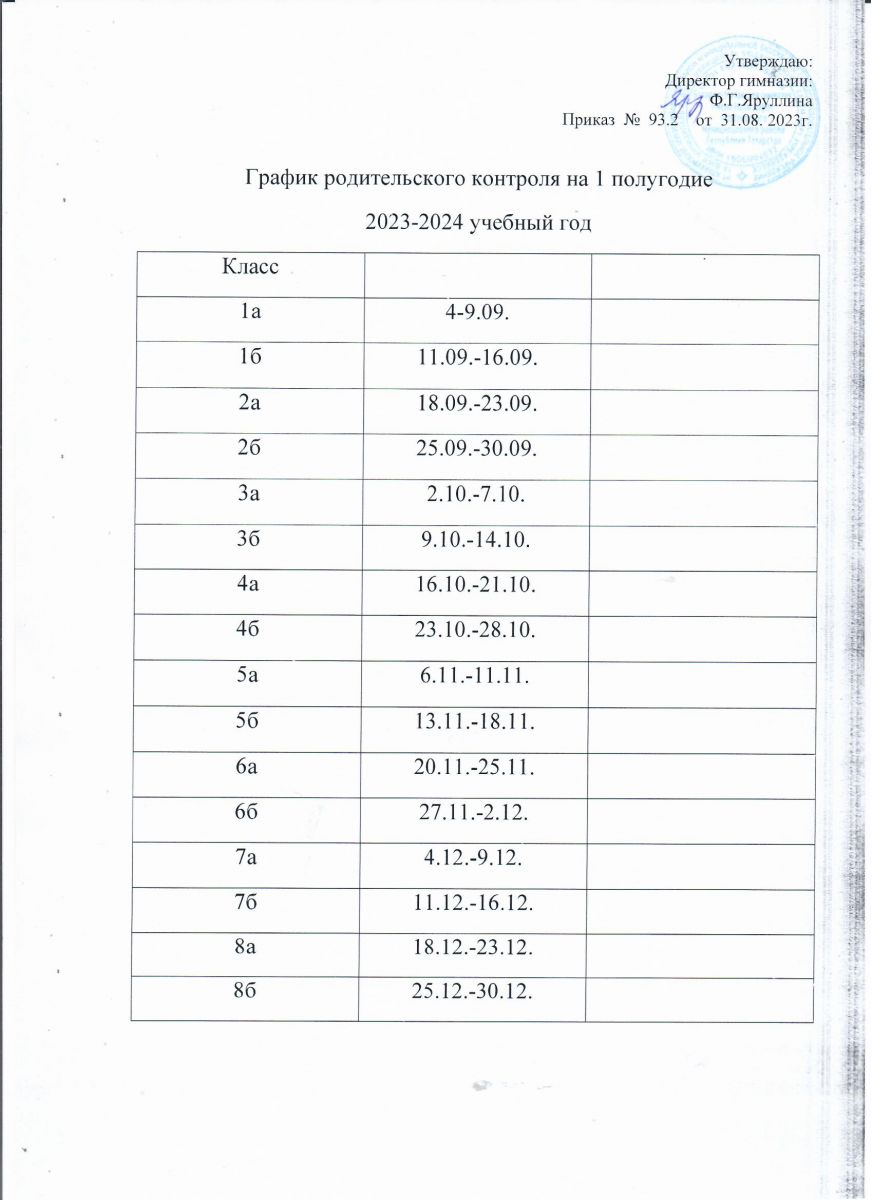 График родительского контроля на 1 полугодие 2023-2024 учебного года