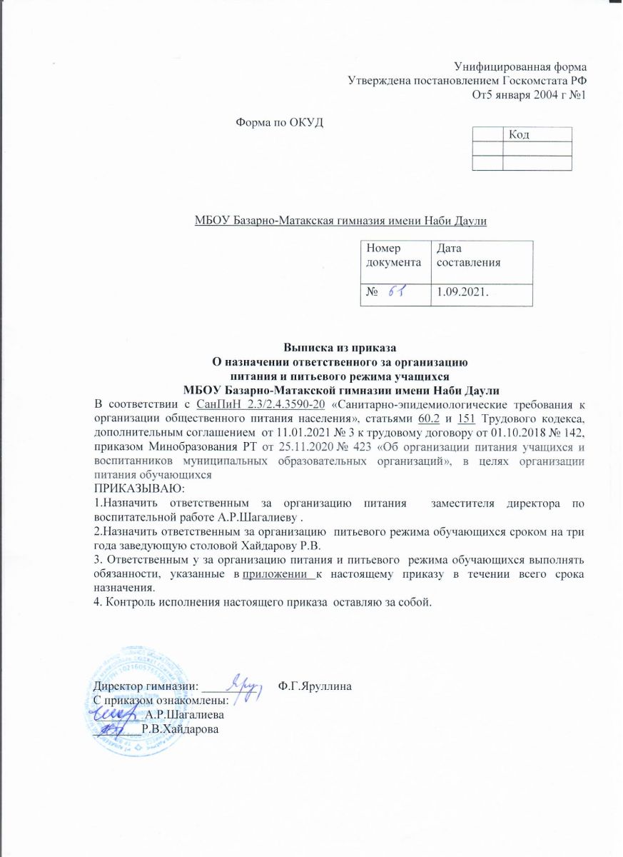 Приказ "Об организации питьевого режима учащихся в 2021-2022 учебном году"