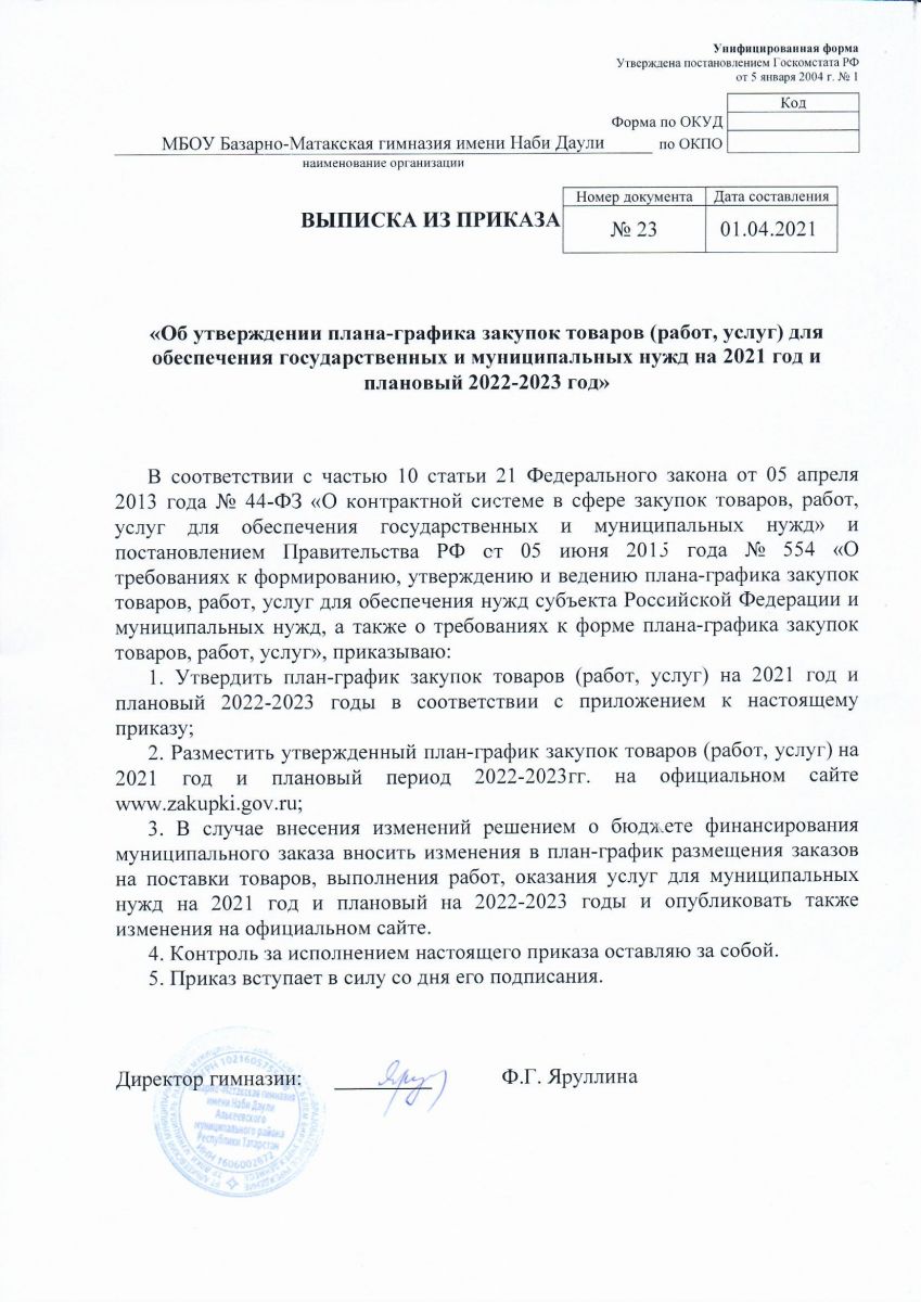Выписка из приказа "Об организации горячего питания на первое полугодие 2023-2024 учебного года"