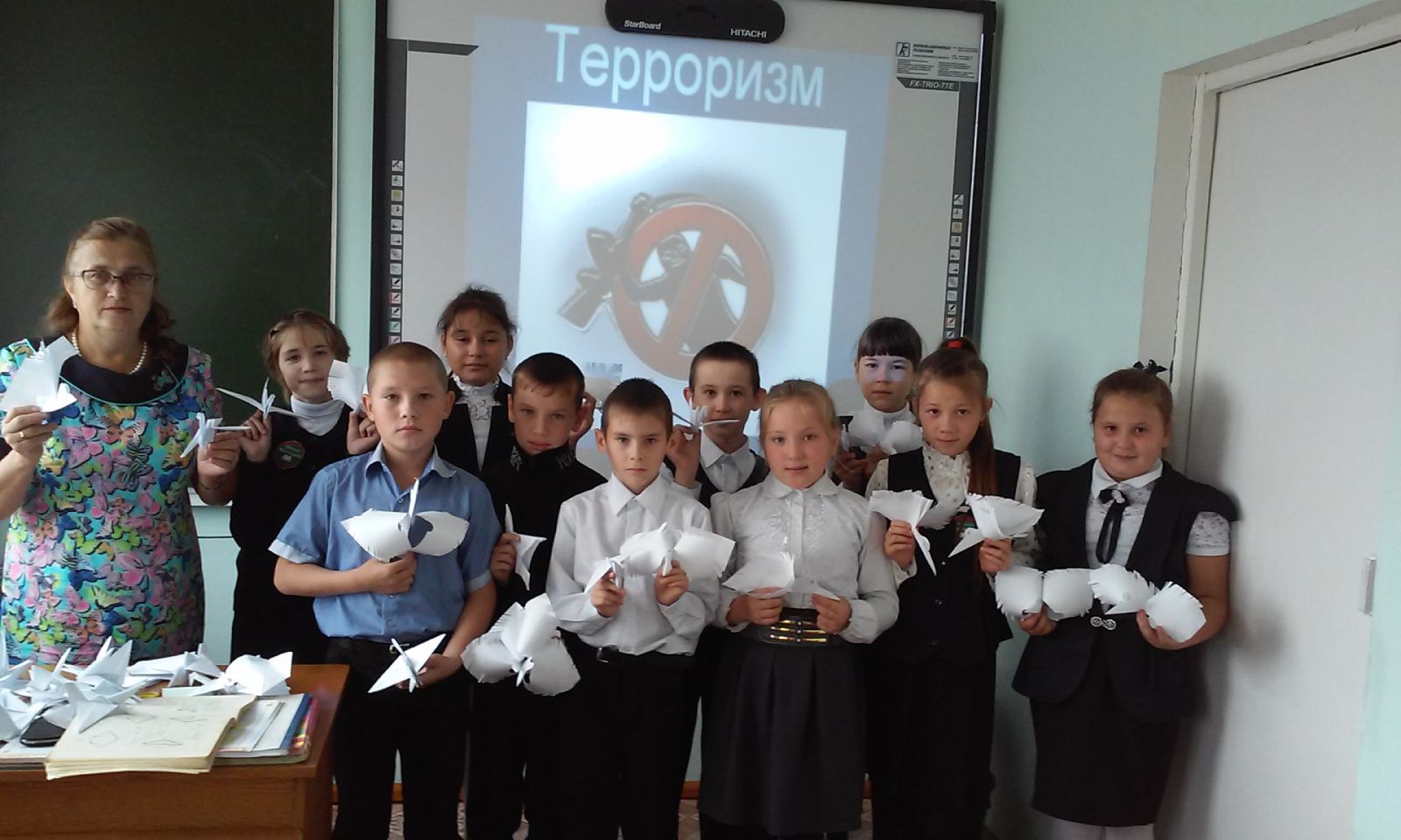 В России ежегодно 3 сентября отмечается особая памятная дата - День солидарности в борьбе с терроризмом. В нашей стране трагическая дата 3 сентября неразрывно связана с ужасающими событиями, произошедшими в Беслане с 1 по 3 сентября 2004 года. Классный руководитель 9а класса провела урок мира с учащимися 8-11 классов. Учащиеся гимназии вспоминали не только жертв осетинской трагедии, но и всех терактов, вспоминали взрослых и детей, погибших от рук террористов, а также сотрудников правоохранительных органов, которые погибли в борьбе с терроризмом, выполняя свой служебный долг. Во всех классах прошли Уроки памяти, ребята смотрели фильм «Беслан: прерванный урок…», завершился день акцией «Белый журавлик» - ребята изготовили бумажных журавликов в память о трагедии в Беслане.