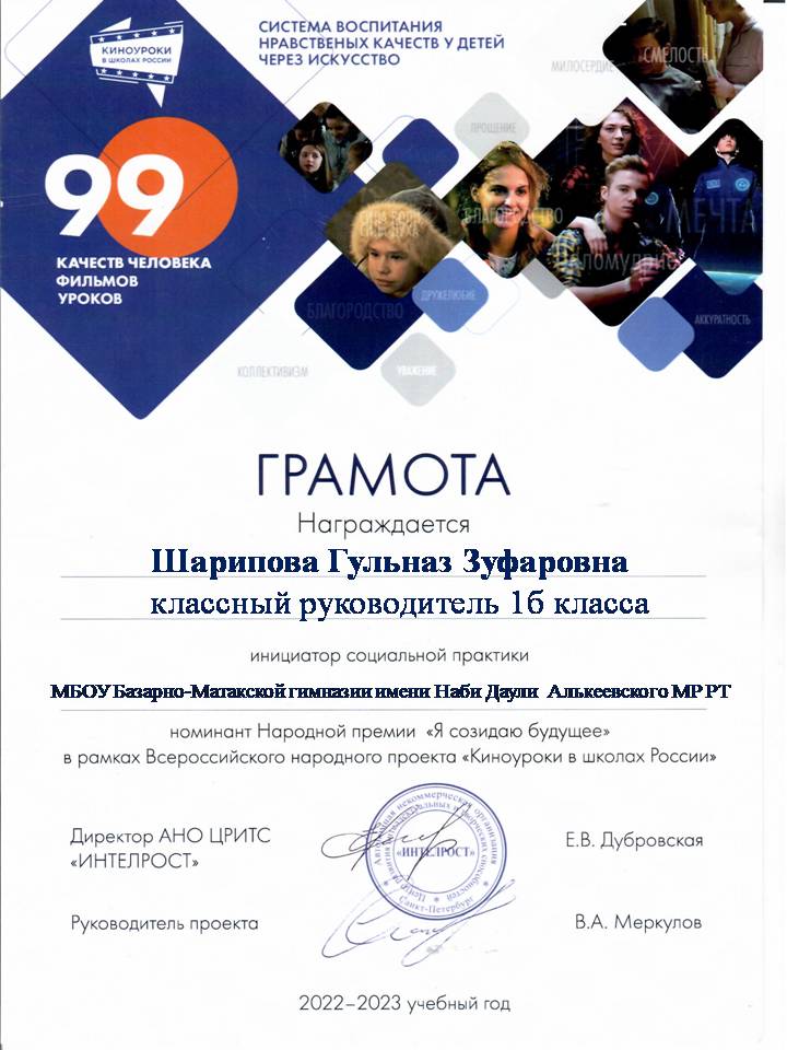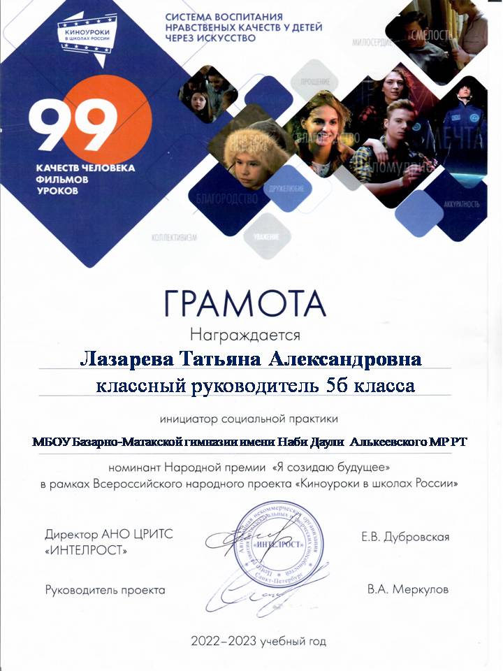 В течение 2022-2023 учебного МБОУ Базарно-Матакская гимназия являлась пилотной площадкой по реализации Всероссийского проекта "Киноуроки в школах России". Цель Проекта – создание инновационной системы воспитания гармонично развитой и социально ответственной личности на основе нравственных ценностей. Миссия Проекта – воспитание поколений выпускников школ 2030-2040 гг. со сформированной широкой библиотекой этических качеств, высоким уровнем социальной и интеллектуальной компетентности.Основой системы воспитания Проекта является проведение социальных практик, реализуемых в соответствии с тематикой просмотренных киноуроков.Цель социальных практик – создание условий для развития у детей и подростков понимания и принятия ценности созидательных качеств личности, формирования потребности в проявлении продуктивной социальной активности. Коллектив гимназии в течение года активно работал по проекту. Учащимися проведено 153 социальных практик. Никто из детей не остался равнодушным. Фильмы вдохновили ребят на свершение добрых дел. За тесное сотрудничество разработчики проекта подарили гимназии книгу из сценариев фильмов. Благодарим команду проекта за сотрудничество, желаем дальнейших успехров и ждем новые фильмы!