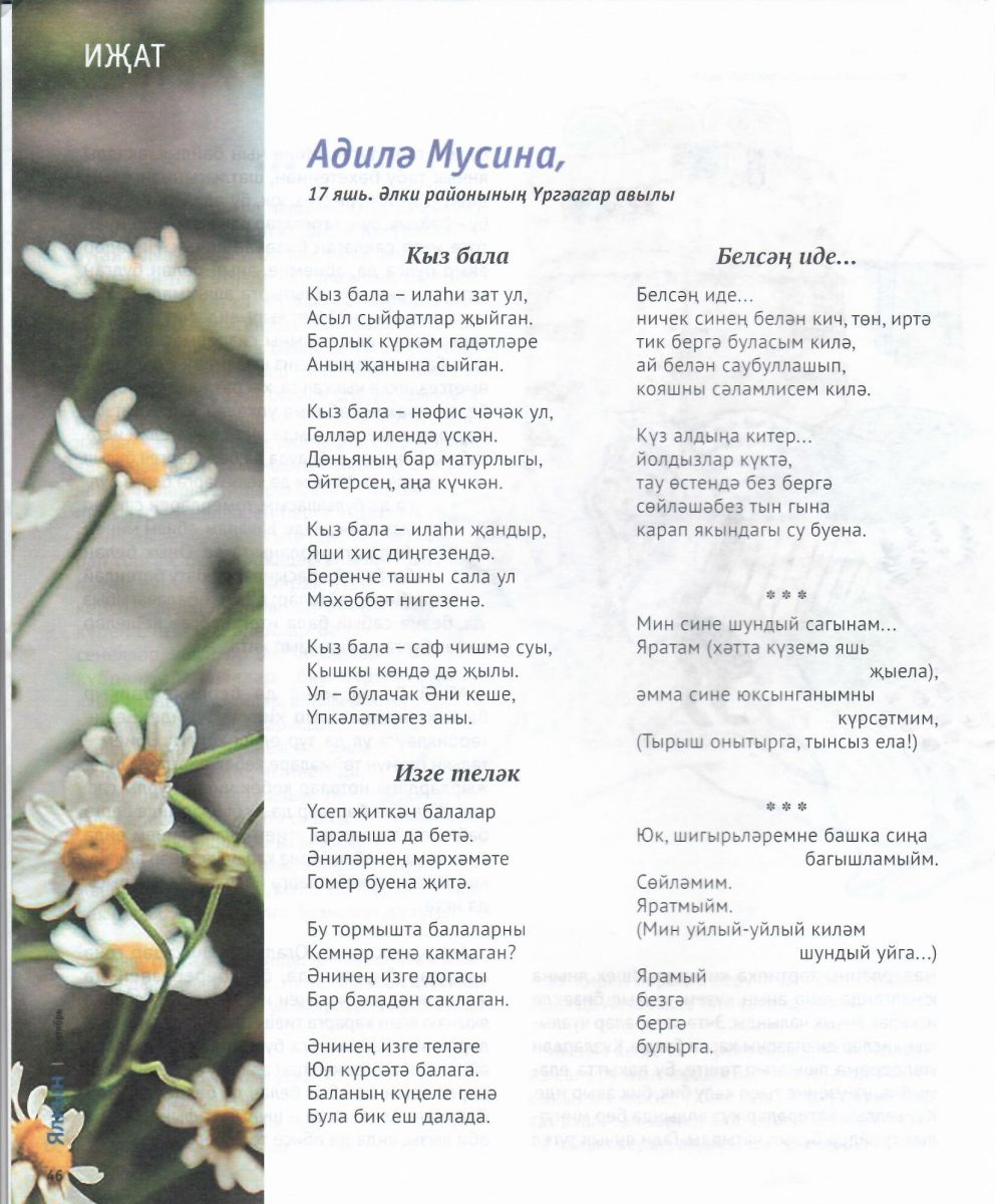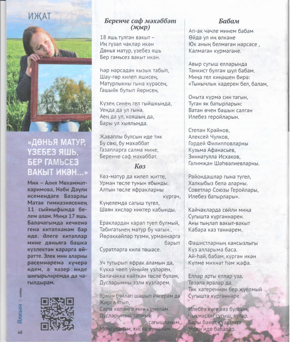 Нәби Дәүли исемендәге Базарлы Матак гимназиясенең 11 нче сыйныф укучылары- Мөхәмәткәримова Алия белән Мусина Адилә инде берничә ел гимназиянең "Алтын каләм"түгәрәгенә йөриләр: үз каләмнәрен чарлыйлар,язу серләренә өйрәнәләр. Алар икесе дә республикабызның төрледән - төрле бәйгеләрендә катнашып,призлы урыннар яулыйлар. Кызларның җитәкчесе-татар теле һәм әдәбияты укытучысы-Шәйхетдинова Алия Илмир кызы. Балалар һәм яшүсмерләр өчен чыга торган "Ялкын"журналының 9нчы,11нче саннарында сез Алия һәм Адиләнең иҗат җимешләре белән таныша аласыз. Афәрин,кызлар!Киләчәктә дә сезгә иҗади уңышлар теләп калабыз!