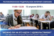 13 апреля 2018 года с 11.00.до 12.30. состоится республиканское родительское интернет-собрание на тему "Можно ли на ЕГЭ идти с удовольствием?"