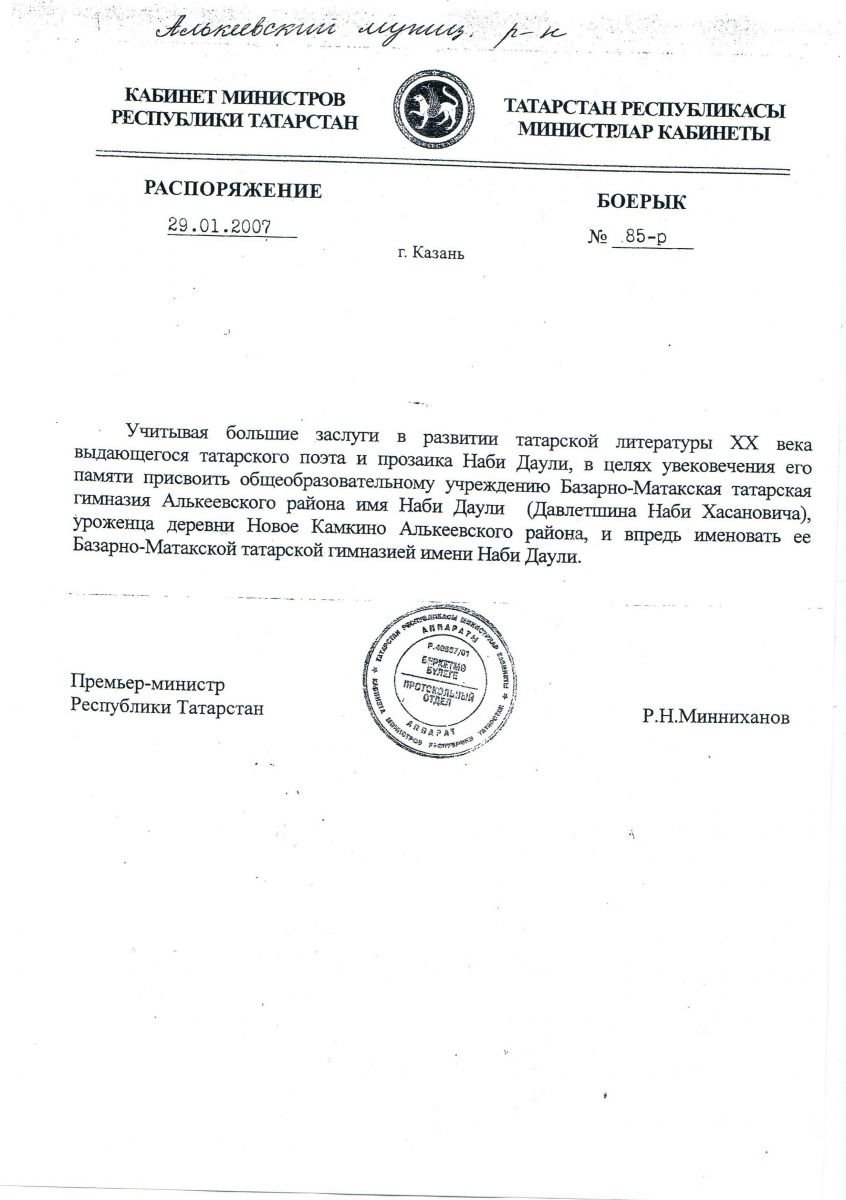 Распоряжение об именовании гимназии Базарно-Матакской гимназией имени Наби Даули