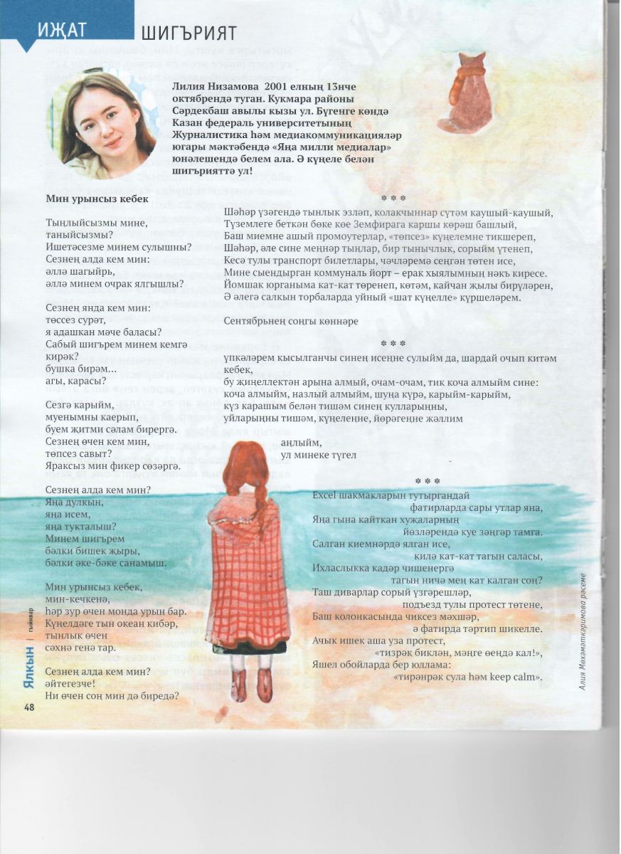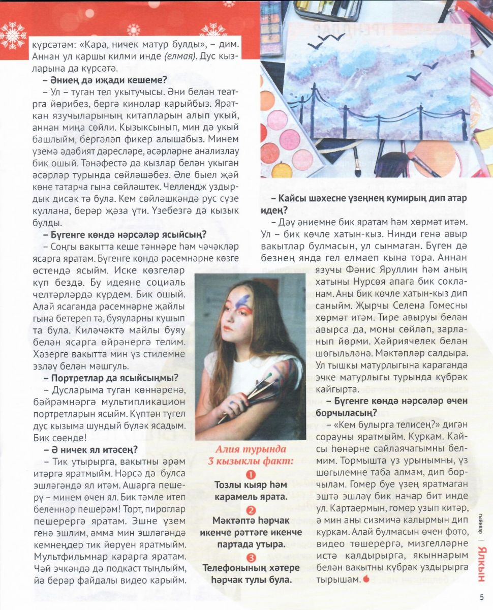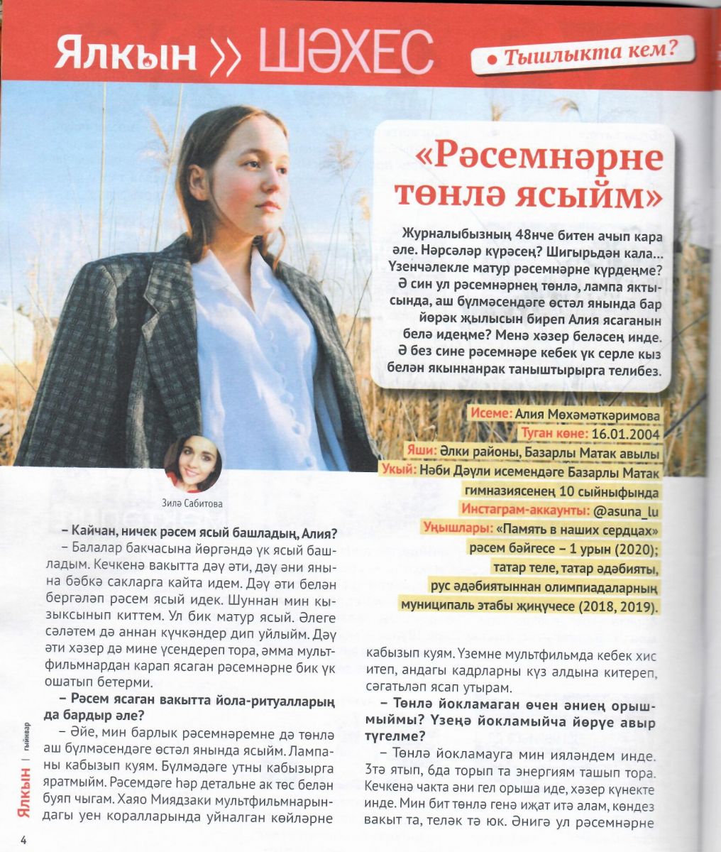Опубликовано: 26.01.2021Учащаяся гимназии имени Наби Даули Алия Мухаметкаримова - яркая, многогранная, талантливая личность. Алия уже с детства увлекается творчеством: поет, танцует, пишет статьи, стихи. Неднократно становилась победителем конкурса эстрадного искусства "Созвездие-Йолдызлык". Сегодня она раскрыла еще один свой талант. Алия- замечательная юная художница. Она начала сотрудничать с подростковым журналом "Ялкын". Алия рисует иллюстрации к стихам. На 48 странице журнала вы всегда сможете познакомиться и насладиться ее творчеством. А январский номер еще больше порадовал нас. На обложке журнала -наша Алия! Интерьвью с ней можно прочитать на 4-5 страницах. Обязательно познакомьтесь с Алией!