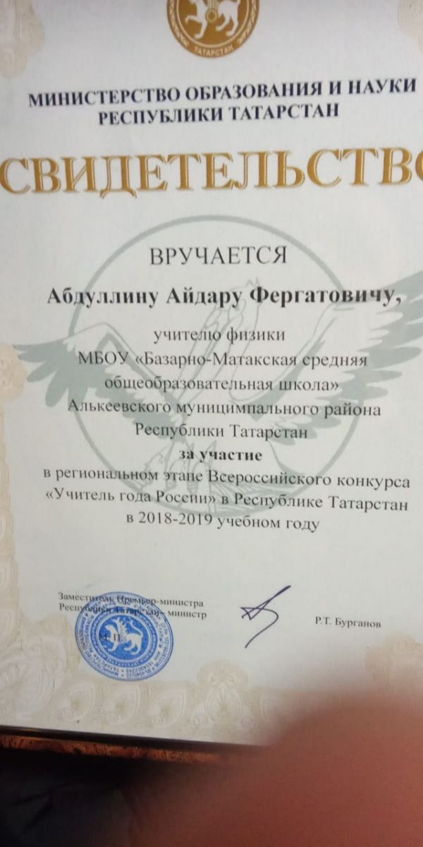 В г.Казани с 11 по 15 марта прошли финальные испытания конкурса «Учитель года». В рамках конкурса «Учитель года–2019», начиная с самого первого этапа, участники распределяются на две номинации с учётом стажа педагогической работы: не более 3 лет – «Педагогический дебют», не менее 5 лет – «Учитель года». Из участников зонального этапа для участия в финале определены 40 педагогов в номинации «Учитель года», 26 – в номинации «Педагогический дебют». Наш район представлял учитель физики Абдуллин А.Ф.. В этом учебном году Татарстан стал одним из шести российских пилотных регионов, которые апробируют новую модель конкурса, как и по перечню мероприятий, так и по организации системы работы жюри и новых подходов к оценке конкурсных испытаний. Айдара Фергатовича пригласили на награждение победителей и участников конкурса, который состоится 15 марта в 15.00 в Поволжской Государственной академии физической культуры, спорта и туризма (Деревня Универсиады, 35).