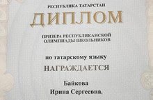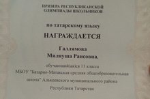 Поздравляем Галлямову М., призера Республиканской олимпиады школьников по татарскому языку. Ее подготовила учитель татарского языка и литературы Хафизова В.Г..
