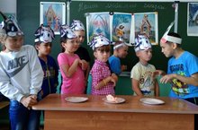 В пришкольном лагере сегодня День инсценировки. Воспитанники лагеря сначала слушали и отгадывали сказки, потом сами группами инсценировали любимые сказки.