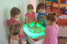 Воспитанники средней группы на световом столе для рисования песком изображают летний день.