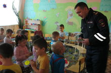 Инспектор ГИБДД Зиганшин Р.Р. посетил воспитанников детского сада и провел беседу о безопасном движении на дороге.