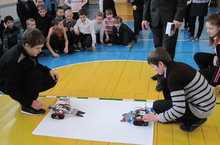 Сегодня во время большой перемены вся школа собралась в спортивном зале, чтобы посмотреть как роботы, сделанные нашими ребятами, соревнуются в различных состязаниях.