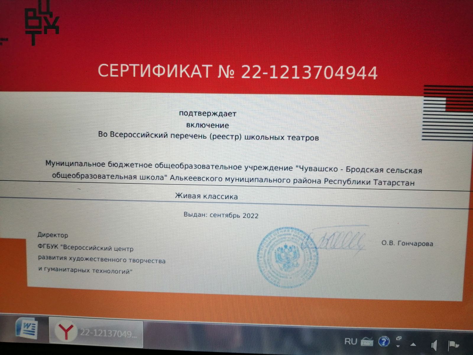 Сертификат школьный театр 22