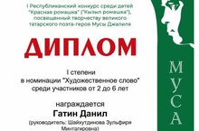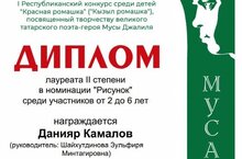 Наши воспитанники приняли участие в I Республиканском конкурсе среди детей "Красная ромашка" ("Кызыл ромашка"), посвящённый творчеству великого татарского поэта-героя Мусы Джалиля. Поздравляем Камалова Данияра - лауреата II степени в номинации "Рисунок", Гатина Данила-I степени в номинации « Художественное слово». Желаем в дальнейшем успехов и творческих побед, благодарим за участие!