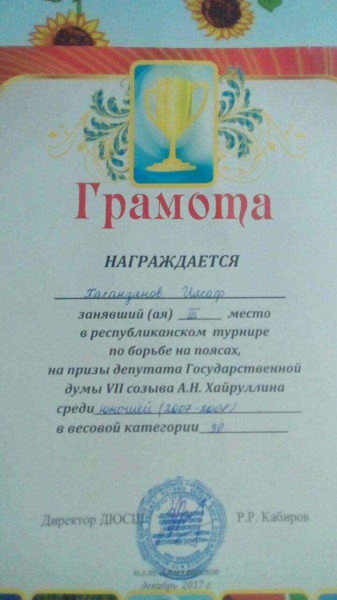 В р.п.Алексеевское состоялся Республиканский турнир по борьбе на поясах на призы депутата Государственной думы VII созыва А.Н.Хайруллина. Наши учащиеся Хасанзянов Ильсаф и Шайхутдинов Радмир заняли почётные 3 места и были награждены дипломами. Поздравляем их с победой и желаем дальнейших спортивных достижений! Молодцы!