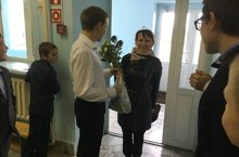 Совет старшеклассников поздравил учителей, встретив их с утра и подарив цветы, открытки, положительные эмоции.