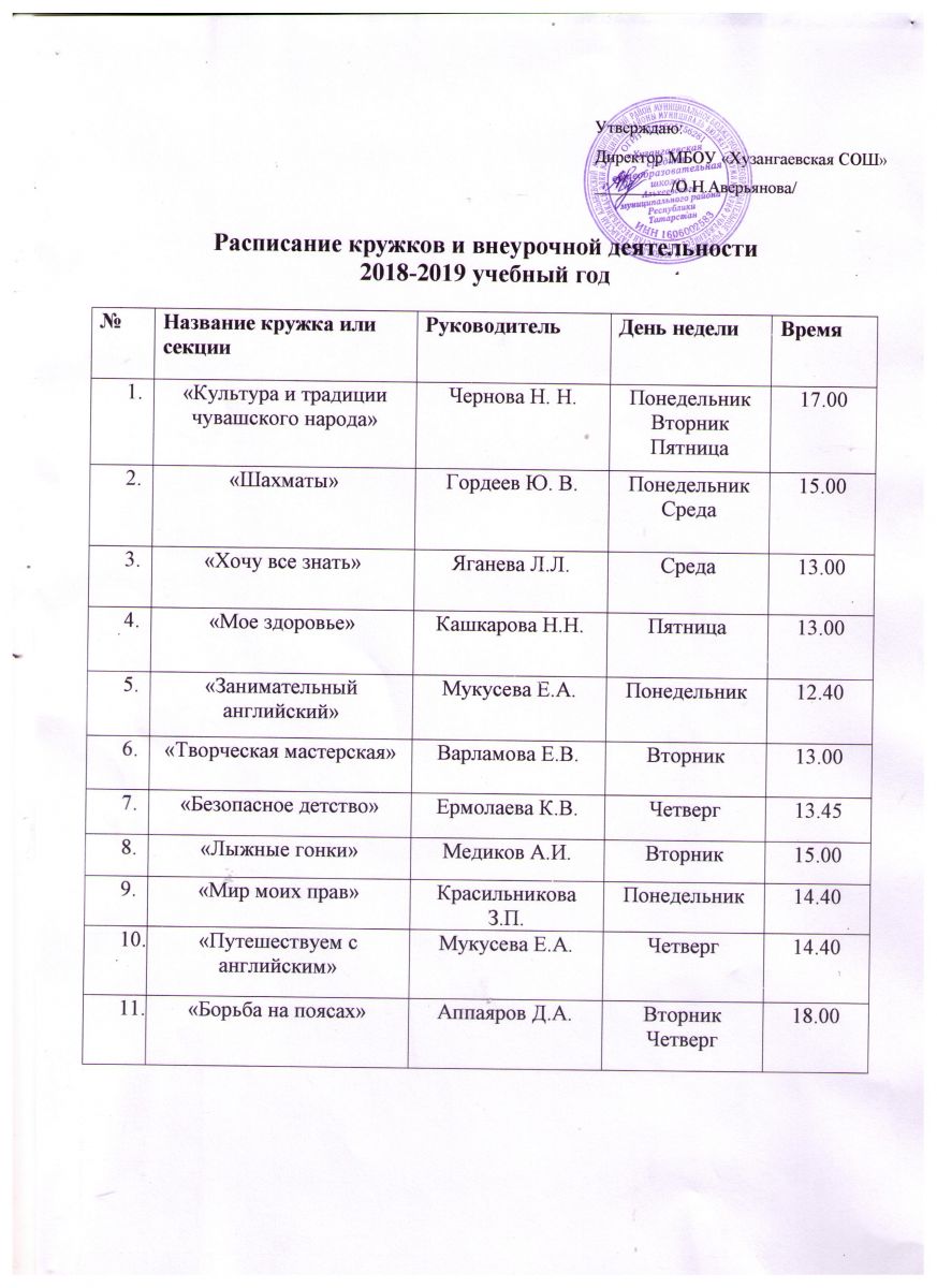 Расписание кружков и внеурочной деятельности на 2018-2019 учебный год