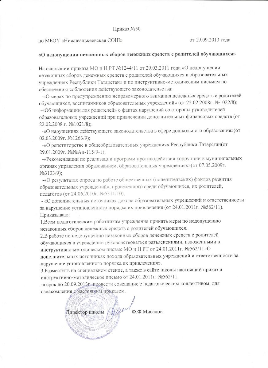 Приказ школы "О недопущении незаконных сборов денежных средств с родителей обучающихся"