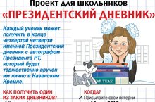 объявлен проект «Президентский дневник» (далее – Проект). Проект представляет собой масштабный республиканский конкурс на самую высокую успеваемость за право получить лично из рук Президента именной «Президентский дневник» с автографом для школьника и диплом от министра образования и науки Республики Татарстан для классного руководителя. Чтобы принять участие в конкурсе на «Президентский дневник» школьник должен получать отметки «5» (отлично) в течение IV четверти текущего учебного года. По итогам конкурса победители, у которых больше всего оценок «5» (отлично),и их классные руководители приглашаются для встречи с Президентом Республики Татарстан и вручения «Президентского дневника» с автографом Президента.Вручение состоится накануне дня защиты детей - 31 мая 2019 года (дата ориентировочная) в Казанском Кремле. -