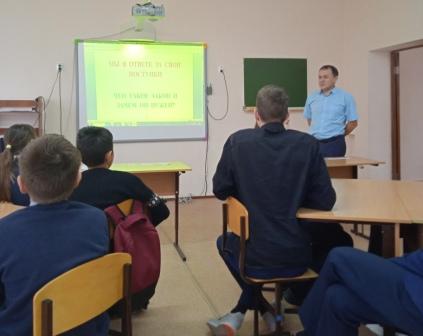 Сегодня учитель истории и обществознания Яшин В.А.провел Единый республиканский урок по правовому просвещению учащихся " Мы в ответе за свои поступки" с участием депутата сельского поселения Махмутова А.Ф. Урок проходил в форме круглого стола. Учащихся познакомили с особенностями уголовной, административной ответственности несовершеннолетних, прописанных в статьях Уголовного Кодекса РФ и Кодекса об административных правонарушениях РФ. Подробно с участниками были разобраны такие понятия как хулиганство, вандализм, причинение тяжкого вреда здоровью, разбой, грабёж и убийство. Ведь все статьи уголовного кодекса караются лишением свободы и предусматривают уголовную ответственность.