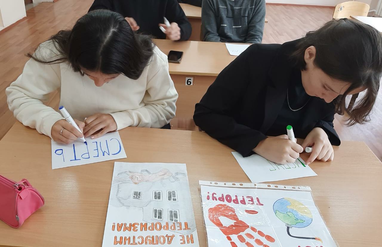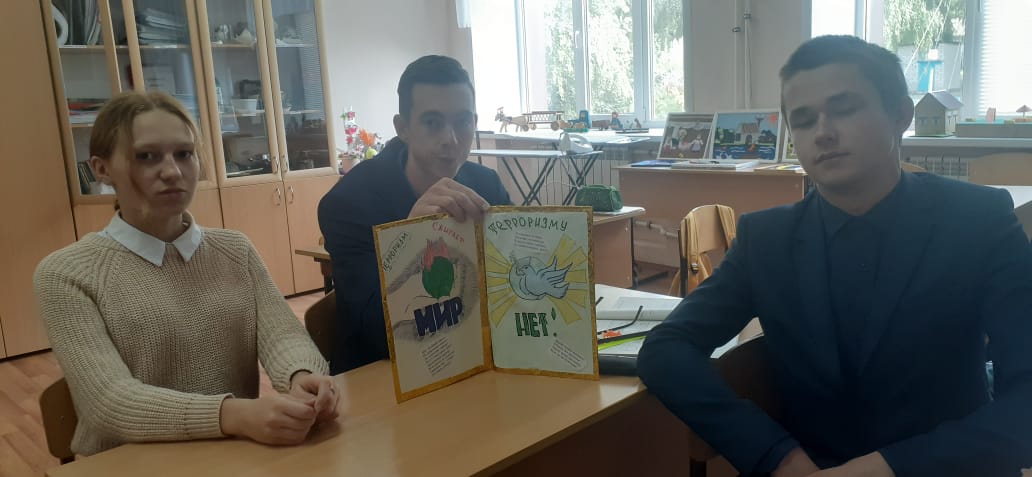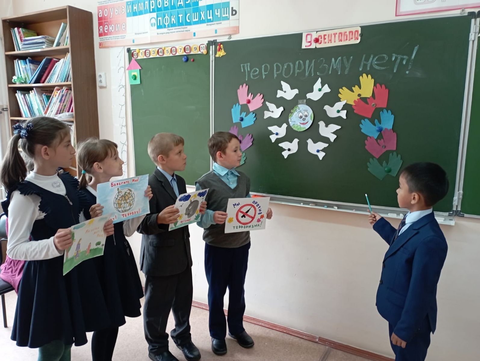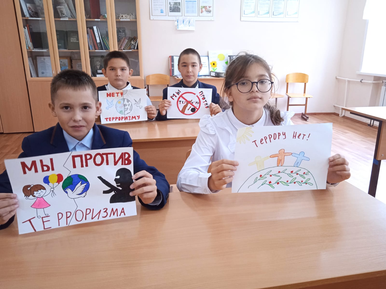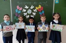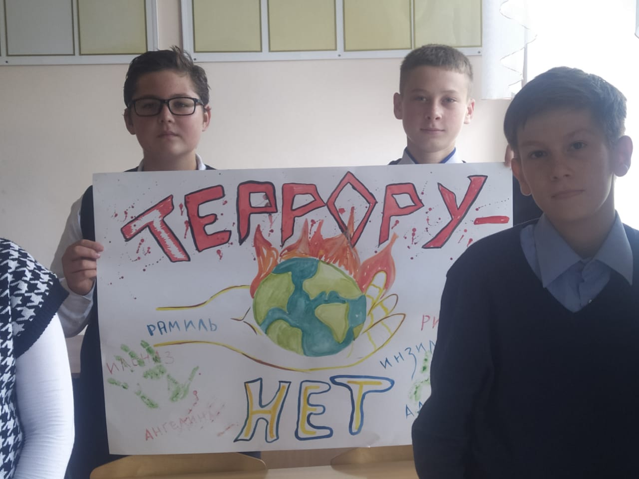 В школе прошли классные часы на тему «Терроризму - нет!», ребята получили представление об этом явлении, какие теракты были совершены в России за последние 17 лет. Отдельно был рассмотрен теракт в Беслане, совершенный 1 сентября 2004 года. Классные руководители обсудили с детьми правила поведения в случае террористической угрозы, детям был предложен алгоритм действий «как не стать жертвой теракта». Ребята получили памятку о правилах поведении в общественном месте в случае обнаружения подозрительного предмета, а также учащимися нарисовали рисунки и плакаты, призывающий уничтожать терроризм во всём мире.