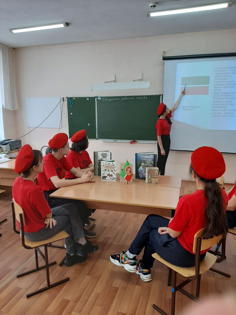 29 ноября отряд юнармейцев имени В.Дубинина и классный руководитель 8 класса Грунина Л.В. участвовали в мероприятии, посвященном Дню Флага Республики Татарстан. Ребята подготовили презентацию о символике родной республики, организовали выставку книг о Татарстане, участвовали в викторине "Республика Татарстан. Страницы истории"