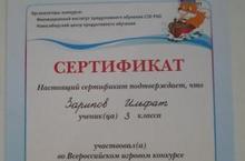 Учащиеся начальных классов: Нотфуллина Диана, Рахматуллина Язиля, Насибуллин Динар, Сафиуллина Диляра , Зарипов Ильфат, Юсупова Регина, Гайфуллин Ринат, Задаев Азат, Хайруллин Алмаз, Рахматуллин Шамиль, Зарипов Ильфат (учителя Халиуллина Г.Ф., Юсупова Е.А., Крашенинникова С.А.) участвовали во Всероссийском игровом конкурсе по естествознанию «Человек и природа». Набрали хорошие баллы. Награждены сертификатами и призами. Молодцы!