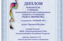 Учащиеся 6 класса (Захарова Е.), 7 класса (Сагиров А.), 8 класса (Грунина В,) принимали участие во Всероссийском дистанционном конкурсе сочинений «Зимний лес» (возрастная группа 5-9 классы) и отмечены Сертификатами участника.