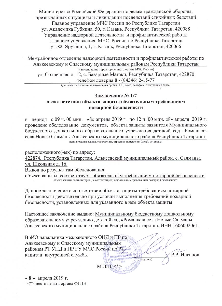 Заключение № 1/7 о соответствии объекта защиты обязательным требованиям пожарной безопасности