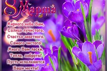 В этот чудесный женский праздник хочется пожелать только положительных эмоций, бескрайнего счастья и крепкого здоровья. Пусть невзгоды обходят стороной, а каждый день будет поводом для новой радости. Чистого мирного неба.