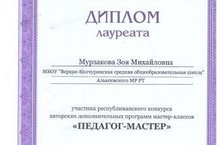 На основании приказа МО и Н РТ от 20.04.15г № 4955 в период с 27 апреля по 1 июля в РТ проведен республиканский конкурс авторских дополнительных программ мастер-классов «Педагог-мастер». На Конкурс было представлено 479 работ. Лауреатами конкурса стали учитель истории и обществознании Баз.Матаковской гимназии Сабитов И.А. с работой «Системный подход в преподавании обществознании», учитель начальных классов В.Колчуринской СОШ Мурзакова З.М. с работой «Занимательная математика».
