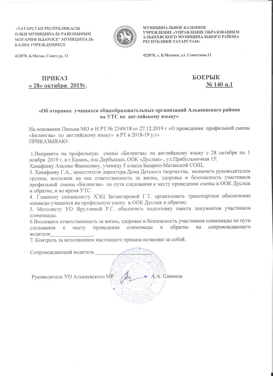 Приказ УО об отправке детей на УТС по английскому языку