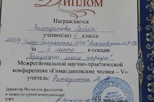 6 нчы сыйныф укучысы Зиятдинова Лейля Зеленодольск районы Гиматдинов С. К. исемендәге Осиново гимназиясе үткәргән региональара "Гыйматдинов укулары-V" онлайн фәнни-практик конференциясендә катнашты. Ул инглиз теле секциясендә "Минем халкымның йолалары" исемле фәнни- тикшеренү эшен яклады. Жюри аның эшен уңай бәяләп, 2 нче урын бирде. Ләйләне һәм аны әзерләгән инглиз теле укытучысы Фатхуллина М. Ф. ны кайнар котлыйбыз! Киләчәктә дә аларга иҗади уңышлар телибез.