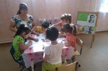 Тәрбияче балаларга краска белән дөрес буяу алымнарын өйрәтте.