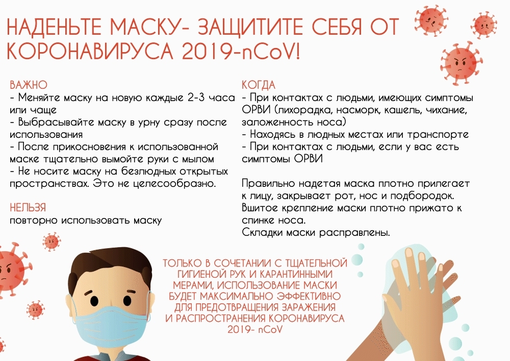 2. Используйте одноразовую медицинскую маску (респиратор) в общественных местах, меняя ее каждые 2-3 часа.