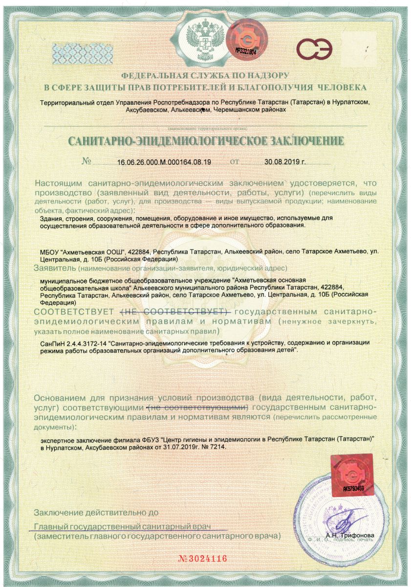 Санитарно-эпидемиологическое заключение №16.06.26.000.М.000164.08.19 от 30.08.2019г