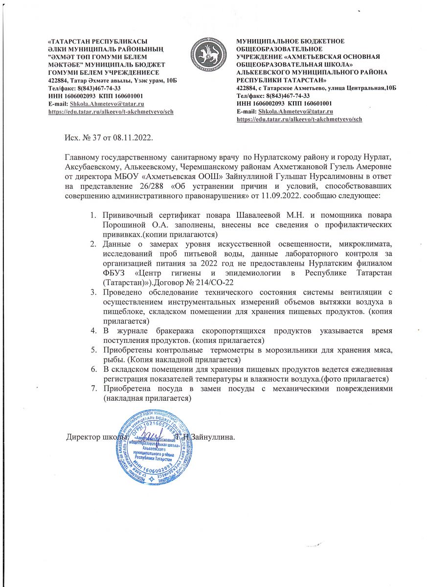 Отчет об устранении предписания Федеральной службы по надзору в сфере ЗПП и благополучия человека по РТ № 26/288 от 11.09.2022