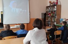 Башлангыч сыйныф укучылары мультфильм карый.