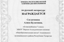Ученица 7 класса на Республиканской олимпиаде по русской литературе стала призёром. Молодец, Алиса!
