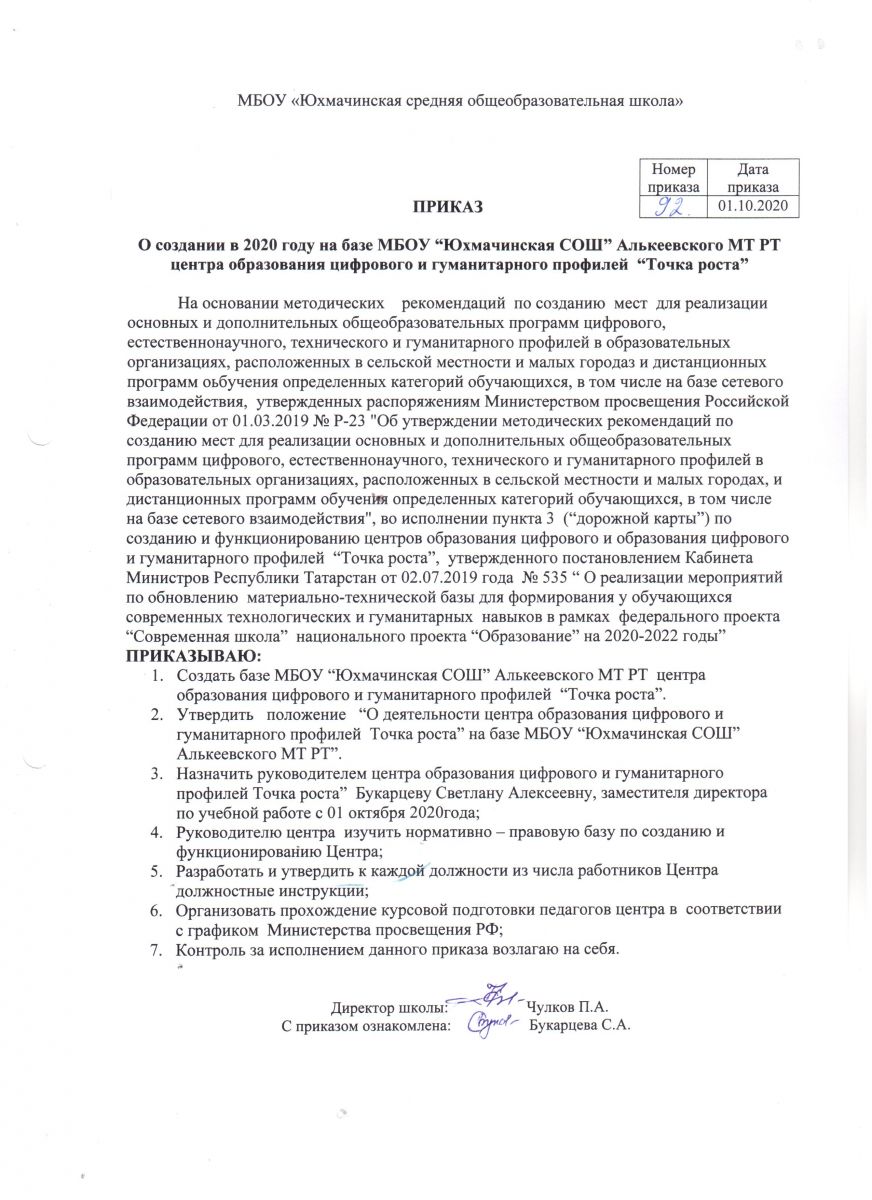 Приказ о создании Центра образования цифрового и гуманитарного профилей "Точка роста"