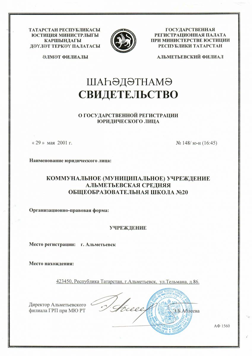 Муниципальное бюджетное общеобразовательное учреждение «Средняя общеобразовательная школа №20» г. Альметьевска Республики Татарстан