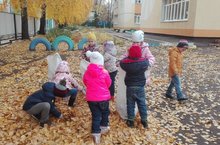 Совместная уборка листьев на участке детского сада.