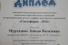Поздравляем воспитателя МБДОУ "Д/с № 52 "Алтынчэч" Муртазину Лейсан Вагизовну с Дипломом в номинации городского смотр-конкурса среди воспитателей ДОУ АМР РТ по предупреждению детского дорожно- транспортного травматизма "Светофорик-2016".