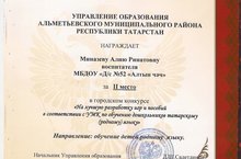 Поздравляем воспитателя МБДОУ "Д/с № 52 "Алтынчэч" Миназеву Алию Ринатовну с Дипломом 2 место городского конкурса "На лучшую разработку игр и пособий в соответствии с УМК по обучению дошкольников татарскому (родному) языку". Молодец!!!