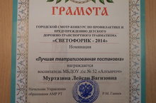 От всей души поздравляем воспитателя Муртазину Лейсан Вагизовну с получением грамоты в номинации "Лучшая театрализованная постановка" в городском смотр-конкурсе среди воспитателей по профилактике и предупреждению детского дорожно-транспортного травматизма. Молодец!!!