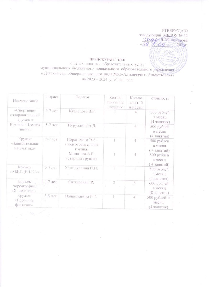 9.4. Документ о стоимости услуг - прейскурант на 2023- 2024 уч. год/Хезмәтләр бәясе турында Документ - 2023-2024 уку елына прейскурант
